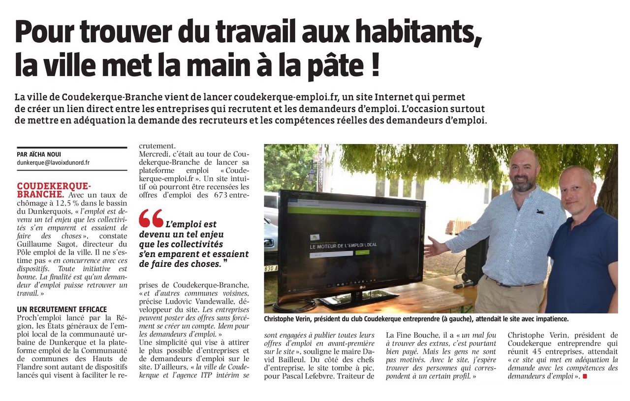 Pour trouver du travail aux habitants, la ville met la main à la pâte ! Posted on 27 juin 2017 by Coudekerque-emploi in Article Article de la voix du nord concernant le lancement du site coudekerque-emploi.fr du 25 juin 2017.